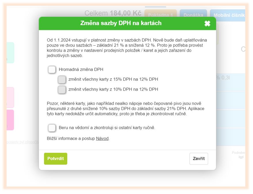 Jednotlivé sazby DPH je možné měnit na jednotlivých kartách nebo hromadně na úrovni kategorie, až od 1.1.2024 od 00:01. Tyto změny je možné provést i v případě otevřených (rozpracovaných) objednávek. Po otevření rozpracované objednávky nebo po kliknutí na Mezisoučet před vyúčtováním se aplikace zeptá na přepočet cen.
