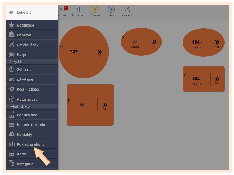 1. Klikněte v menu aplikace na Pokladní úkony.