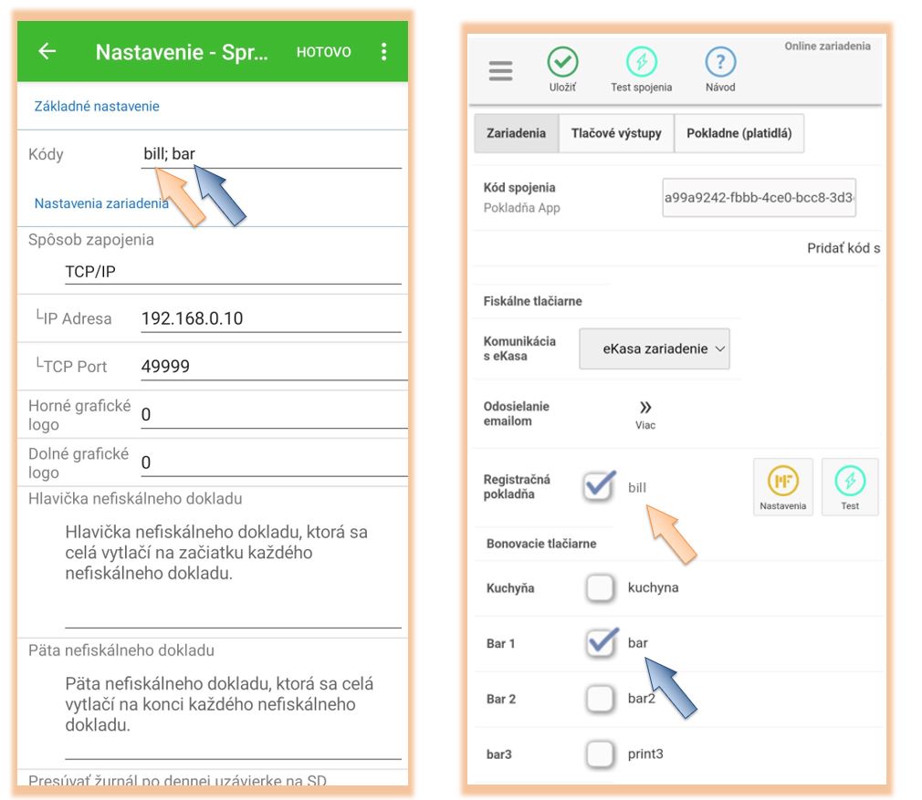 - Kódy - kódy slúžia na identifikáciu zariadenia v systéme a musia sa zhodovať s kódom zariadenia v menu aplikácie iKelp POS Mobile pre predaj v časti Zariadenia. V prípade definovania len jednej tlačiarne v systéme, môžete ponechať prednastavený kód, a v nastaveniach Zariadení v predaji aktivujte príslušnú tlačiareň. V prípade definovania viacerých tlačiarní, nastavte všetky príslušné kódy pre toto zariadenie. Pozor, ak jedno fyzické zariadenie má slúžiť aj na tlač účteniek aj ako barová bonovačka, v aplikácii sa toto zariadenie definuje len raz, ale je možné mu nastaviť dva kódy. (Jedno fyzické zariadenie, v tomto prípade Efox, plniace funkciu fiskálnej tlačiarne a bonovačky.)
