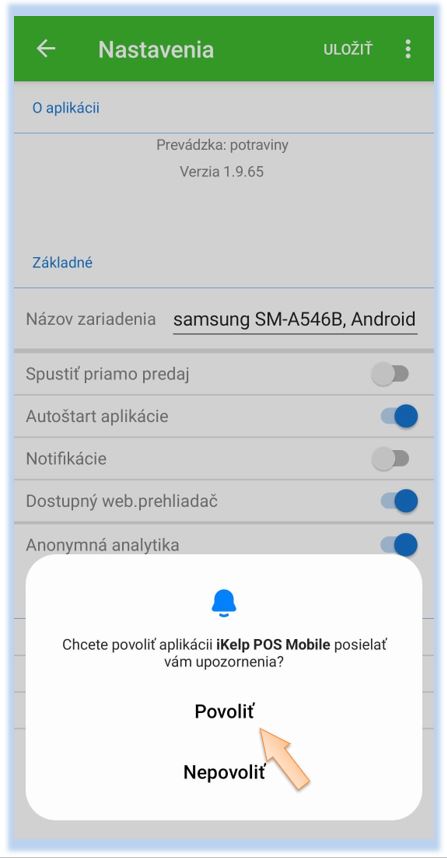 - Kliknite na Povoliť, pre povolenie posielania upozornení z aplikácie iKelp POS Mobile.