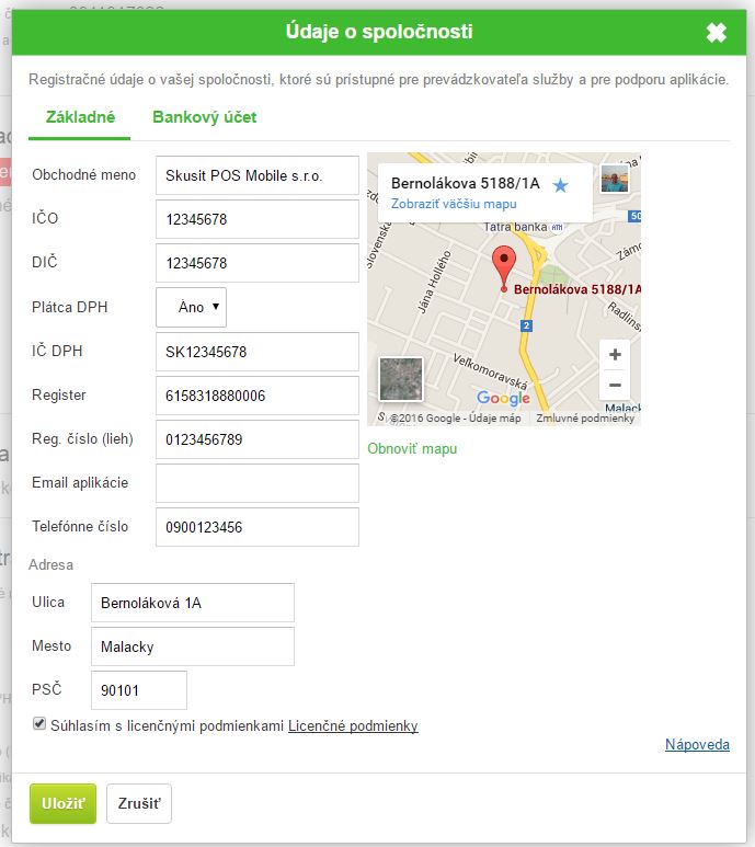 Obchodné meno - obchodné meno spoločnosti je potrebné vyplniť tak, ako je spoločnosť evidovaná na obchodnom, ale živnostenskom registri. Nezadávajte sem názov prevádzky.