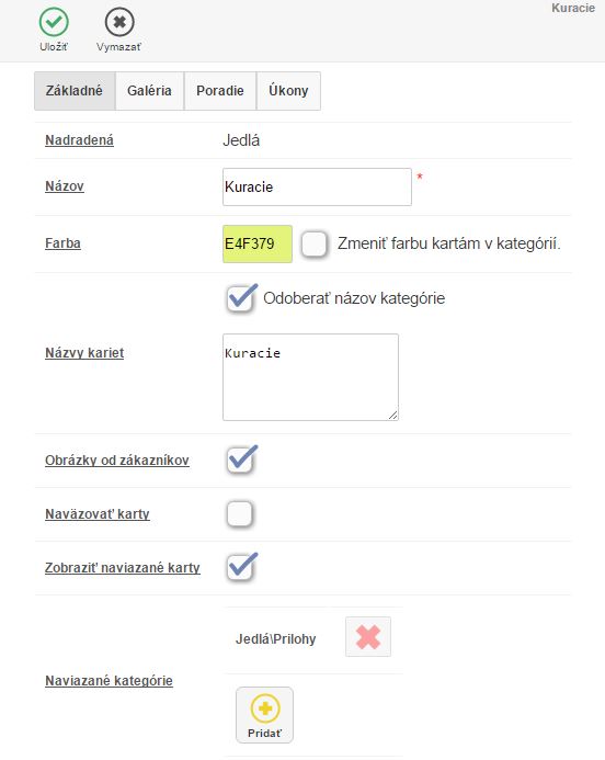 Naviazané kategórie - kategórie, ktoré sa zobrazia po pridaní položky do dokladu. Pri jedlách je vhodné sem pridať kategóriu príloh a nápojov. (Nastavenie je vhodné napr. pri jedlách, kde môžete v časti Naviazané kategórie pridať napr. kategóriu Prílohy alebo Nealko. Akonáhle sa v predaji pridá do objednávky jedlo, zobrazí sa ponuka naviazaných kategórií z ktorých je možné vybrať prílohu, prípadne nealko a nie je tak potrebné sa preklikávať medzi ďalšími kategóriami. Rovnako je tak toto nastavenie možné aplikovať aj pre ostatné kategórie.)
