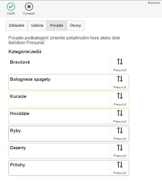 - Možnosť nastavenia poradia kategórií danej úrovne, ako sa budú zobrazovať pri predaji. Pri úprave kategórie sa zobrazujú len kategórie, ktoré sú v rovnakej úrovni ako upravovaná kategória.