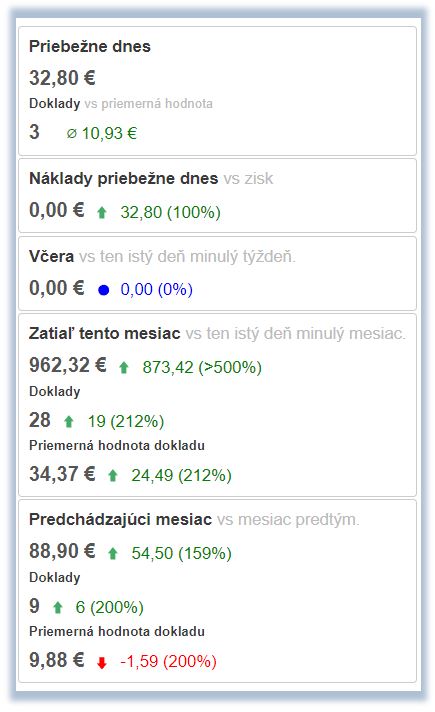 - Priebežne dnes - zobrazenie predajov (obratu) v celkovej sume s DPH. Do tejto sumy sú započítane bločky, doklady ktoré boli ukončené ako odložené a v prípade aktívneho filtra pre započítanie dodacích listov aj dodacie listy ktoré boli vytvorené v predaji aplikácie. Informácia o predajoch sa zobrazuje na základe vyfiltrovaného časového obdobia. Zobrazuje sa tu aj počet dokladov vytvorených v danom období, rovnako s porovnaním a zobrazením trendu za predchádzajúce obdobie, spolu s priemernou hodnotou dokladu.