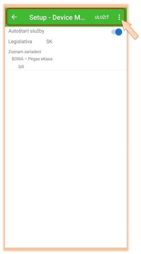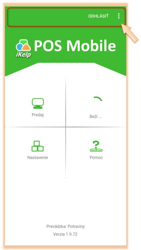 - ikona menu slúži pre odoslanie logov zo zariadenia, nastavenie polohy zariadenia (v prípade prenosnej pokladnice), alebo zobrazenie návodu aplikácie..