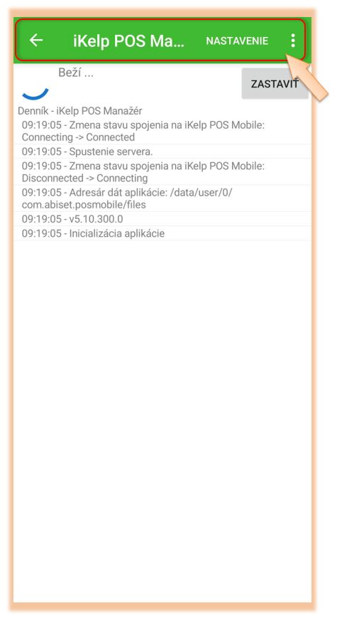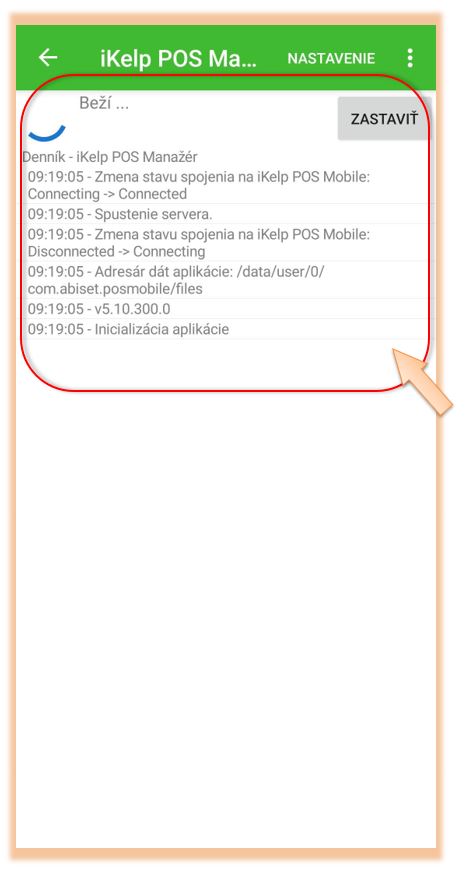 - Log aplikácie - stav spojenia medzi aplikáciou iKelp POS Mobile a samotnou webovou časťou pre predaj. Po kliknutí na Spustiť / Zastaviť je možné túto komunikáciu dočasne pozastaviť, alebo ju opätovne spustiť.