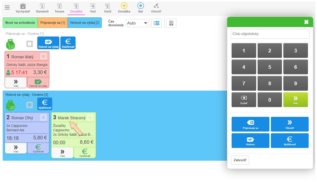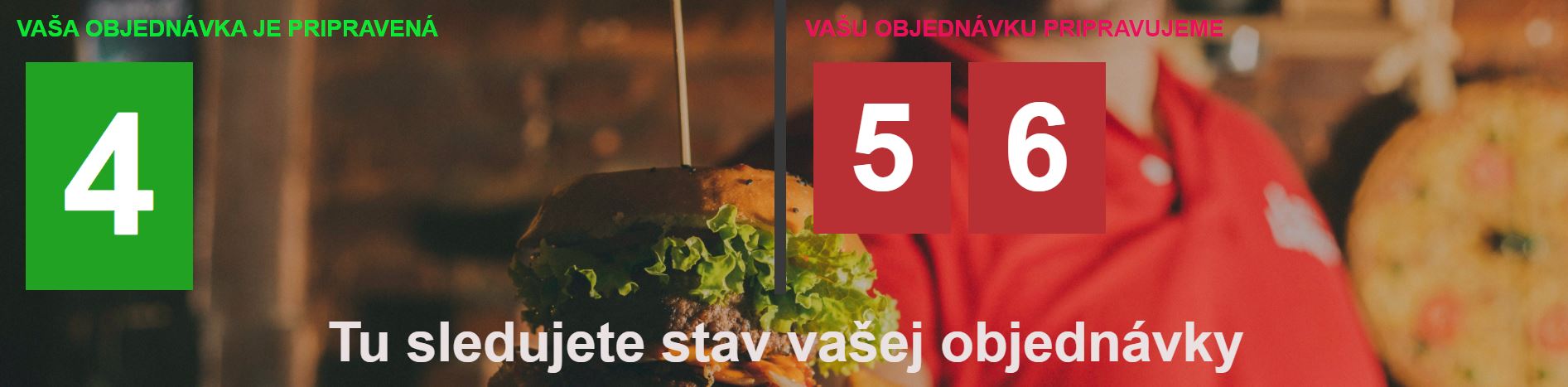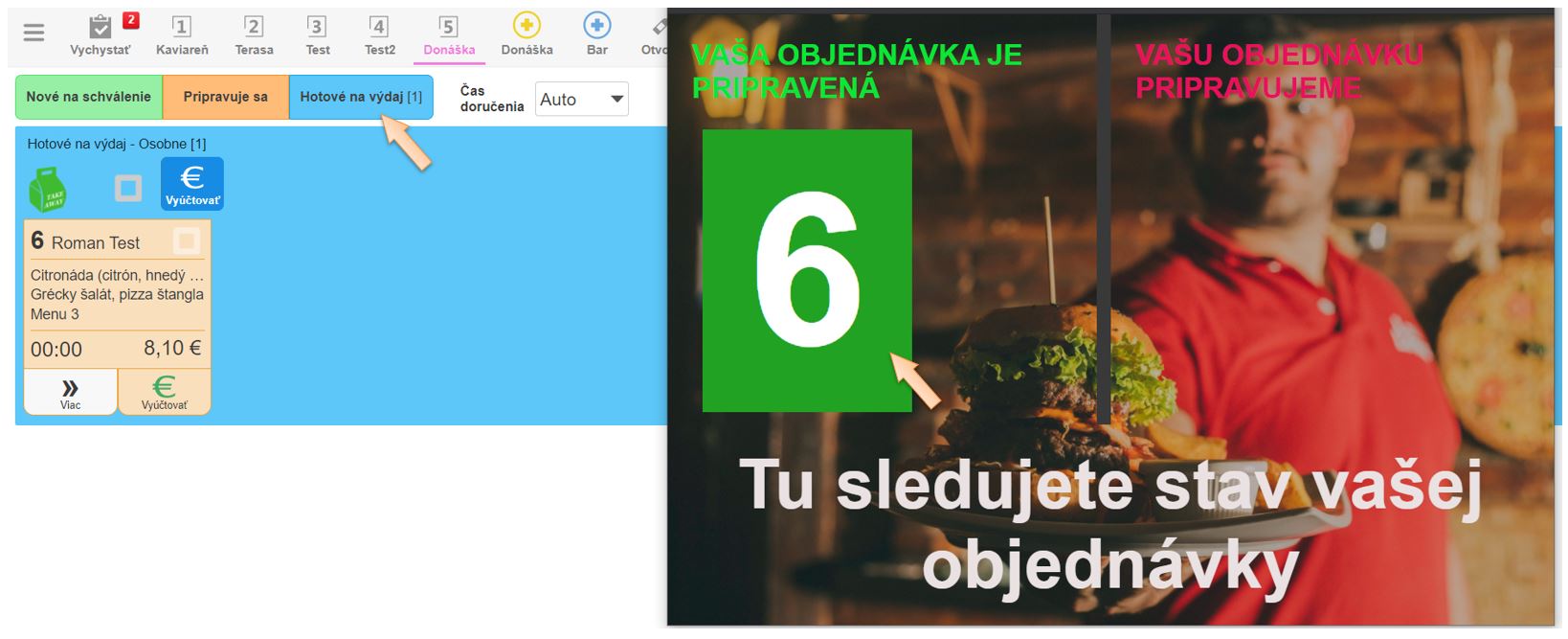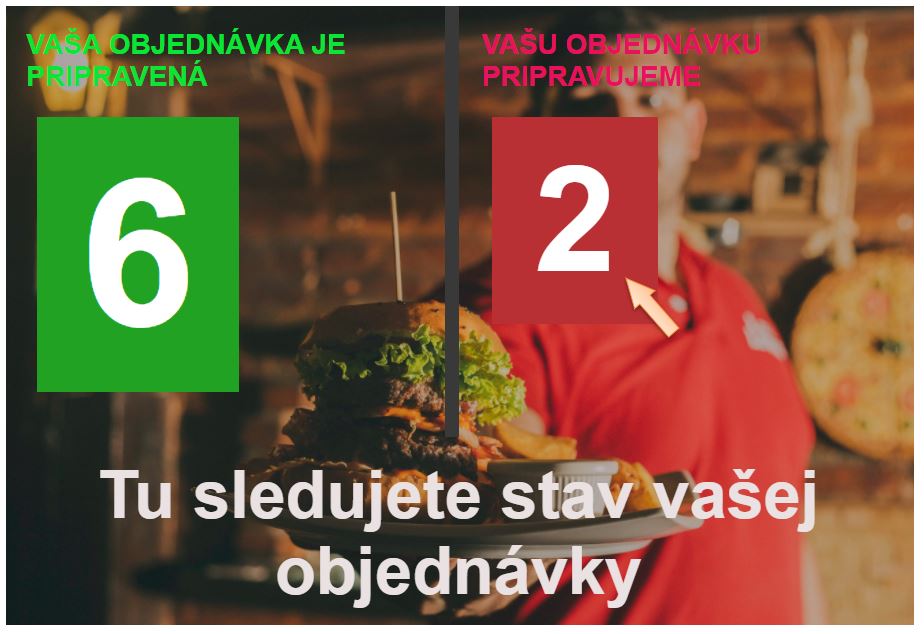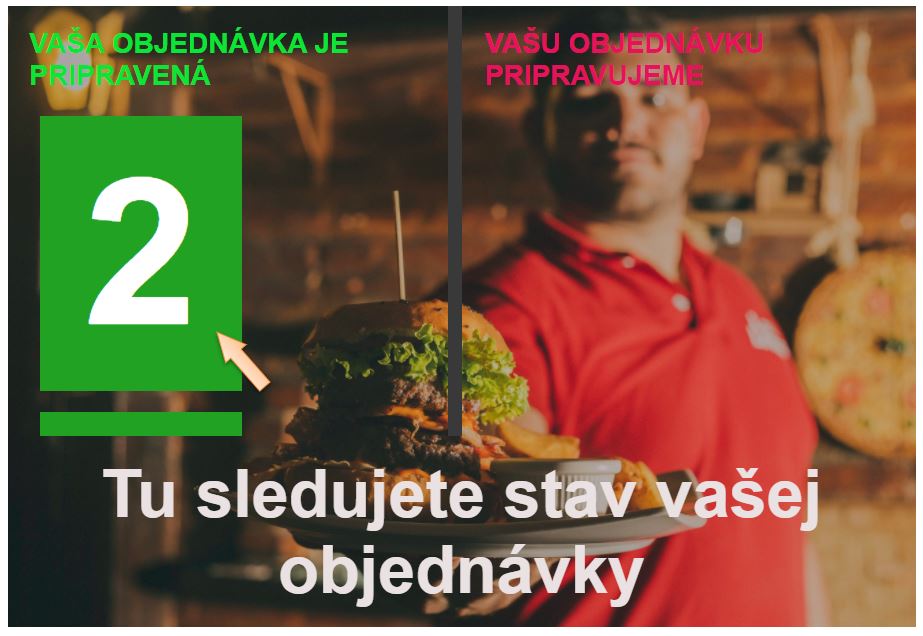 Po vytvorení novej objednávky zákazníkom sa obsluhe zobrazí informácia o novej objednávke. Po jej potvrdení zákazník vidí pri stave vybavovania objednávky aj poradové číslo objednávky, resp. číslo výdajového lístka ktoré sa automaticky zobrazí aj na výdajovom displeji.