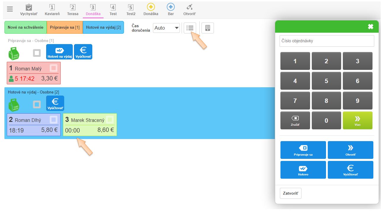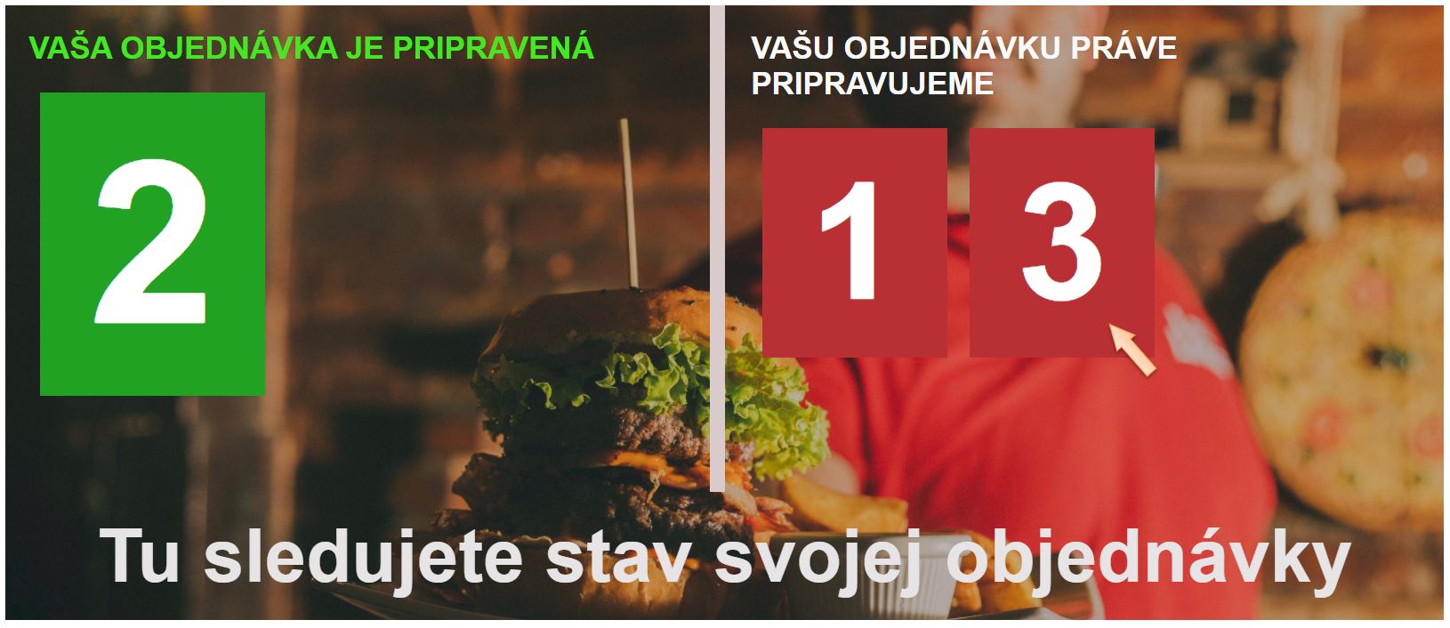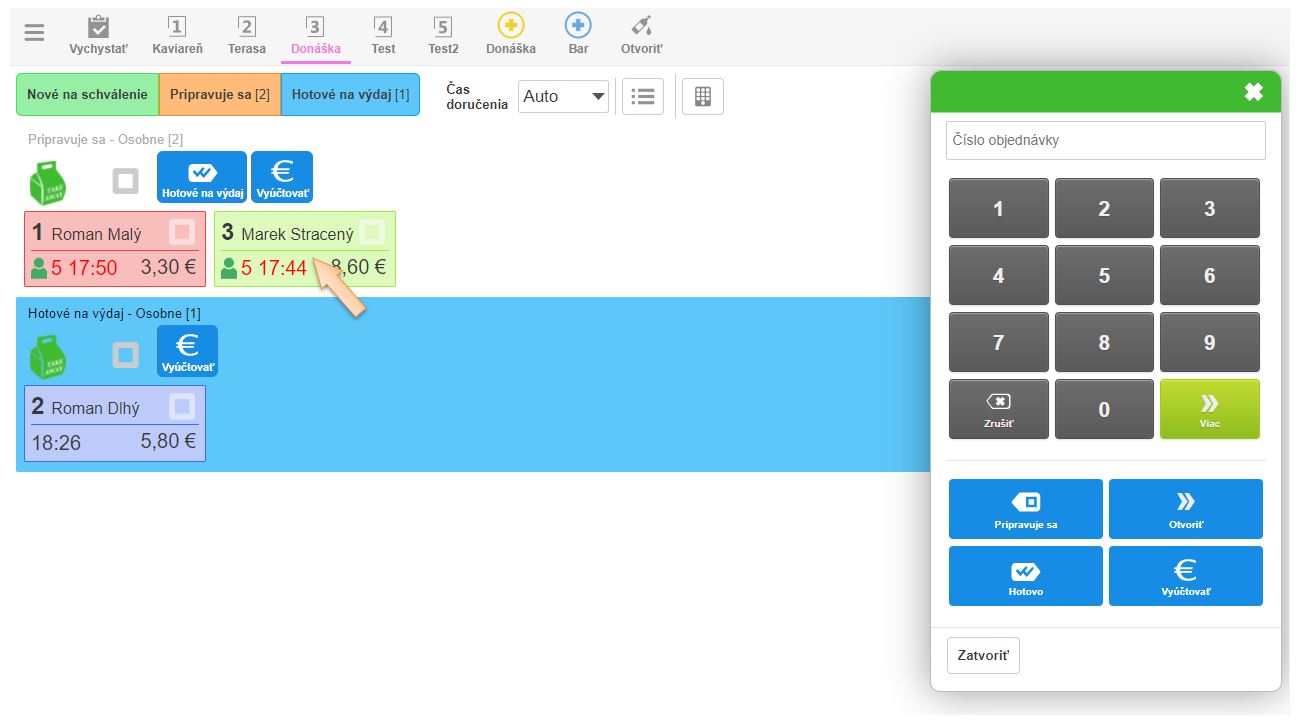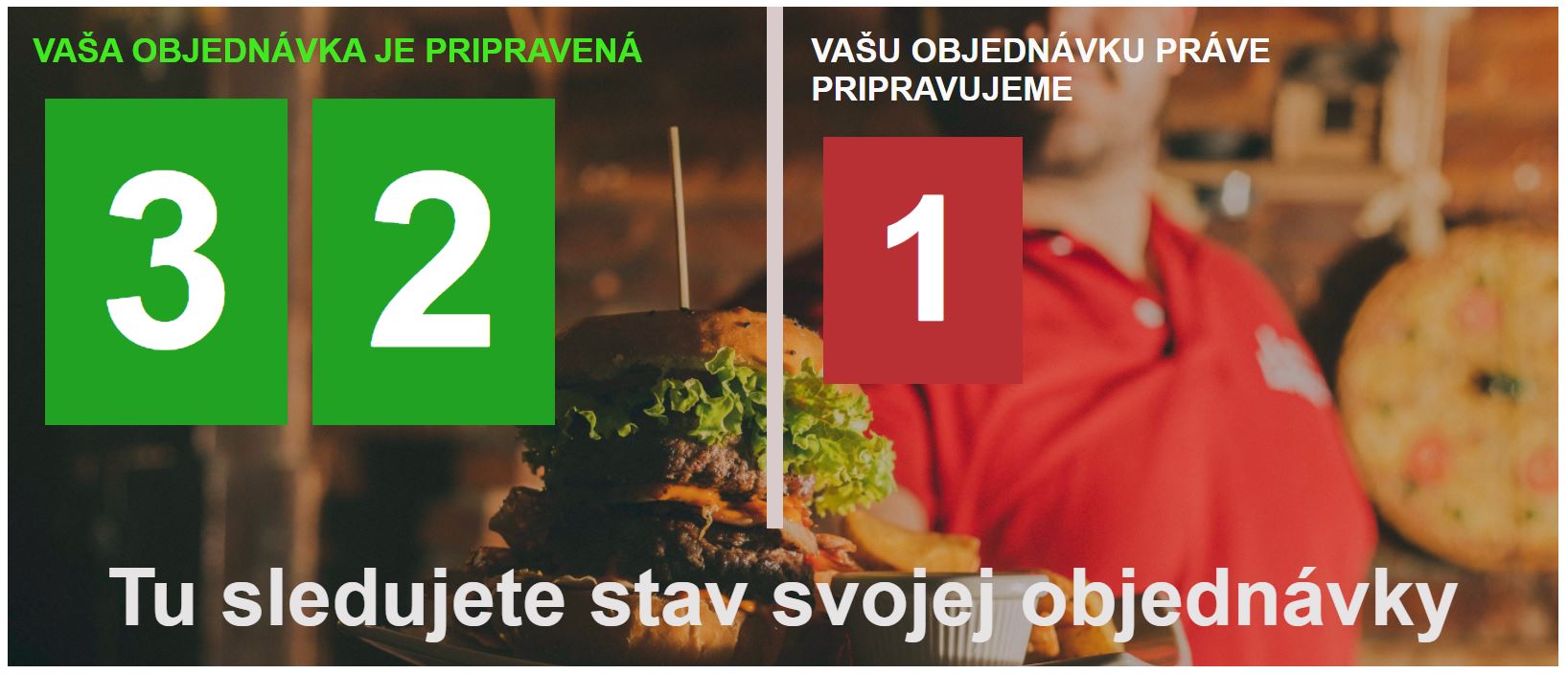 Po vytvorení novej objednávky zákazníkom sa obsluhe zobrazí informácia o novej objednávke. Po jej potvrdení zákazník vidí pri stave vybavovania objednávky aj poradové číslo objednávky, resp. číslo výdajového lístka ktoré sa automaticky zobrazí aj na výdajovom displeji.