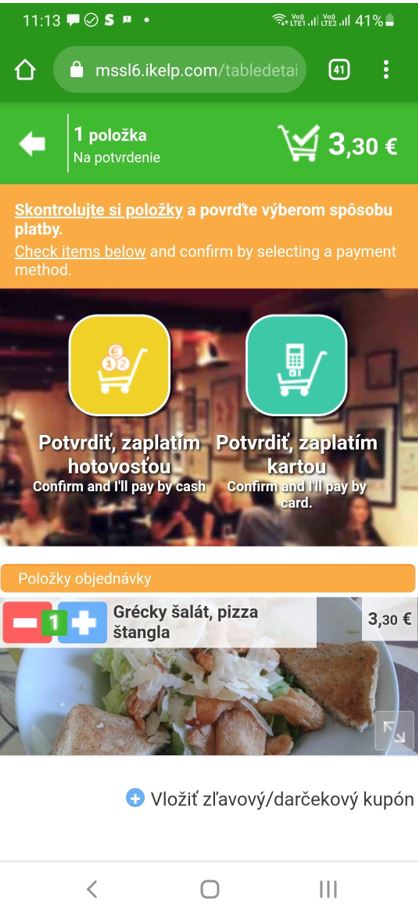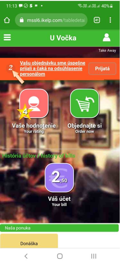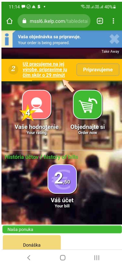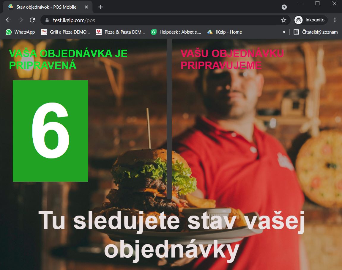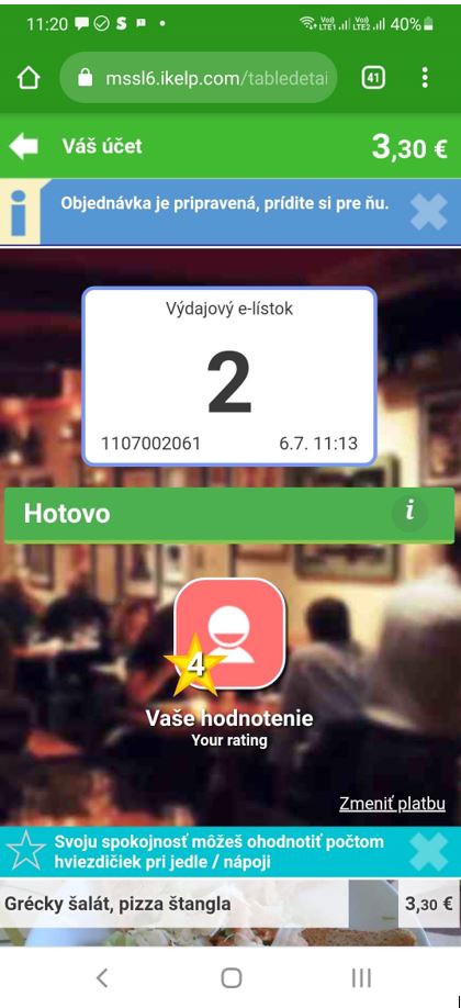 3. Online objednávka cez web reštaurácie s osobným vyzdvihnutím - zákazník sleduje proces vybavovania objednávky na svojom mobile na ktorom má aj elektronický lístok s poradovým číslom výdaja. Na základe neho vie priamo na prevádzke alebo vo svojom mobile sledovať priebeh vybavovania objednávky. Viac sa dozviete v návode Bufetový systém s online objednávaním v iKelp POS Mobile.