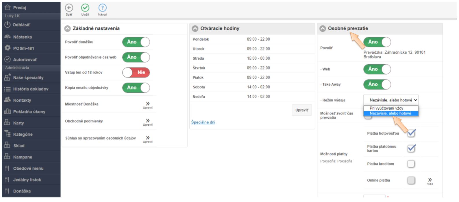 2. Nastaviť režim výdaja - znamená, ako sa bude objednávka správať v procese vybavovania.
