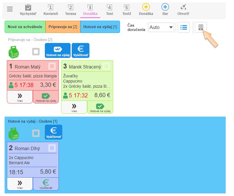 • Vyúčtovanie pri prevzatí - ak sa objednávka platí až pri preberaní, obsluha po príprave objednávky kliká na Hotové na výdaj, na objednávke nevidí informáciu o úhrade objednávky. Na výdajovom displeji sa mení stav na Hotové na výdaj, a obsluha pre vybavenie objednávky kliká na tlačidlo Vyúčtovať.