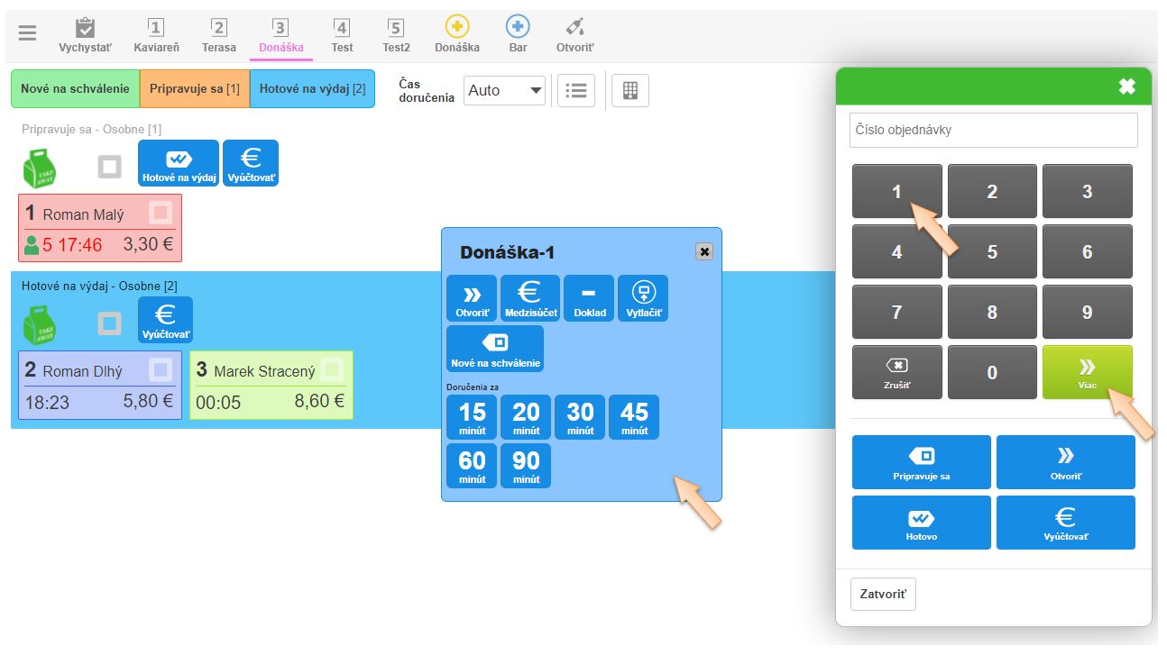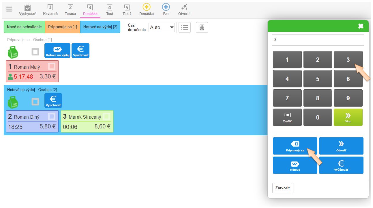 • Po vybavení objednávky, resp. prevzatí časti objednávky zákazníkom zadajte číslo objednávky a kliknite na tlačidlo Pripravuje sa. (Objednávka opäť prechádza do stavu Pripravuje sa na výdajnom displeji a zákazník ďalej čaká na jej vybavenie.)