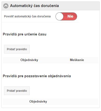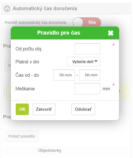 • Povoliť automatický čas doručenia - systém na základe pravidiel vie automaticky vyhodnocovať odhadovaný čas doručenia na základe počtu rozpracovaných objednávok v systéme a zákazník tak dostane presnejšiu informáciu o tom, kedy bude objednávka vybavená, resp. pripravená. Jednotlivé časy doručovania sa zobrazujú aj zákazníkovi po kliknutí na Online objednávanie v záložke Kontakt. Ak je splnené niektoré z nižšie nadefinovaných pravidiel pre meškanie objednávky, zobrazí sa to zákazníkovi v tomto okne a rovnako je na to upozornený aj v procese tvorby objednávky.