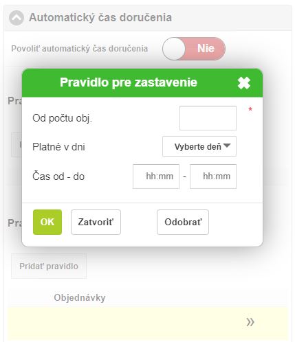 • Pridať pravidlo - kliknutím na tlačidlo Pridať pravidlo je možné nadefinovať, za akých okoľností sa systém objednávania pozastaví.