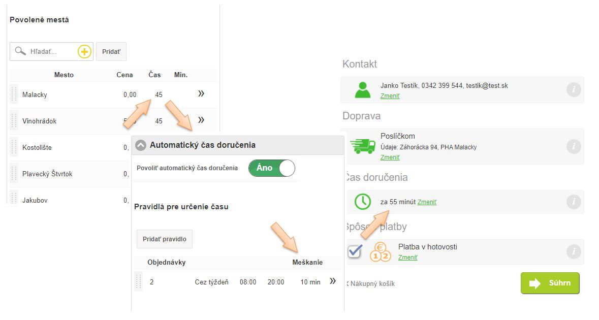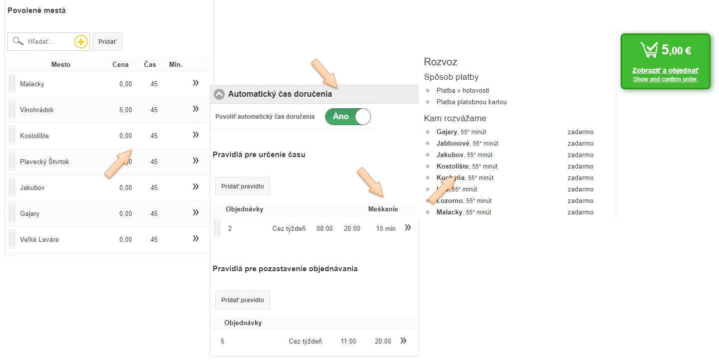 • Čas doručenia - predbežný čas ktorý sa zobrazí zákazníkovi pri vytvorení a následnom potvrdení objednávky. Čas je vhodné definovať aj v závislosti vzdialenosti od prevádzky. (Čas pre doručenie bude pravdepodobne iný v rámci zóny, kde sa nachádza prevádzka ako do vedľajšieho zóny rozvozu vzdialenej niekoľko km.)