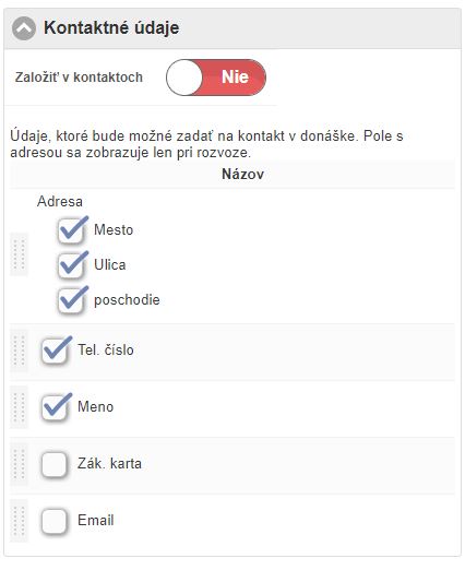 • Údaje, ktoré bude možné zadať na kontakt v donáške. Pole s adresou sa zobrazuje len pri rozvoze.