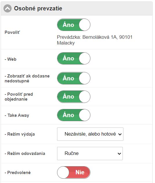 Definícia nastavení pre možnosť osobného prevzatia