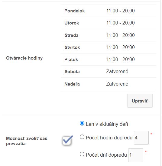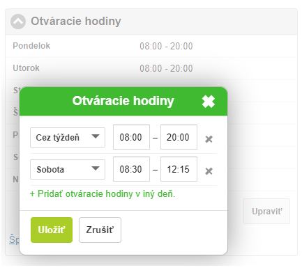 • Otváracie hodiny - zmenu otváracích hodín je možné vykonať po kliknutí na tlačidlo Upraviť. Otváracie hodiny je možné nastaviť akokoľvek presne podľa požiadaviek.
