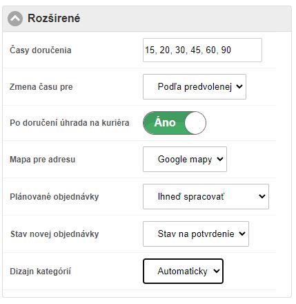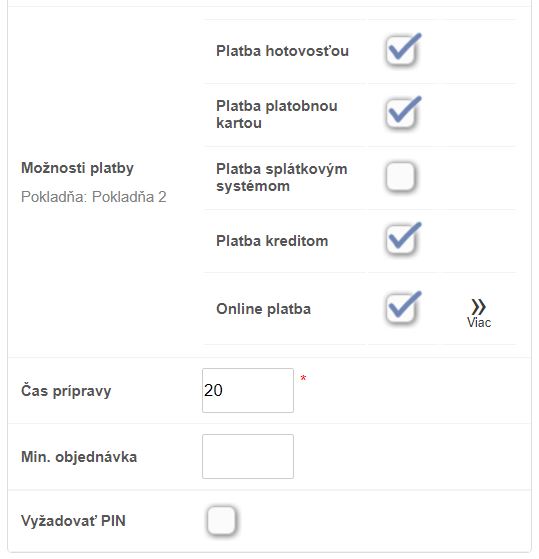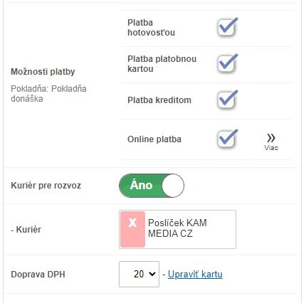 • Okrem základných nastavení ako Cena dopravy, Čas doručenia a Min. objednávka, je možné po kliknutí na Viac zobraziť ďalšie nastavenia.