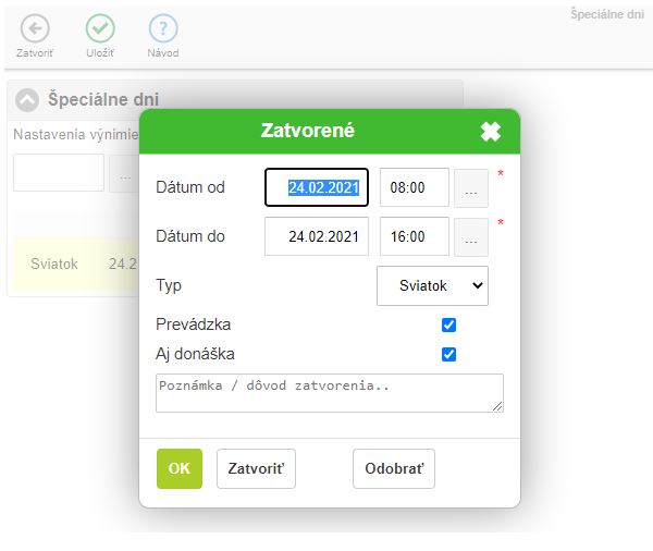 • Špeciálne dni - Okrem bežných otváracích hodín je možné nastaviť aj tieto. Špeciálne dni. Jedná sa o dni, kedy sa nebude variť. Tieto môžete nadefinovať aj vopred. Tieto je možné využiť napr. ak je sviatok,  prípadne sa nerobí donáška alebo sa nevarí z prevádzkových, alebo iných dôvodov. Viac o nastavení sa dozviete v návode Otváracie hodiny - Špeciálne dni.