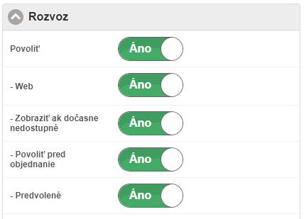 • Povoliť - nastavenie definuje, či má byť pri tvorbe online objednávky táto možnosť aktívna. Môže sa stať, že z nejakého dôvodu nemôžete realizovať rozvoz. Vtedy sa táto možnosť deaktivuje a zostane aktívna len možnosť osobného prevzatia. Akonáhle sa obnoví možnosť rozvozu, pri nových objednávkach budú mať zákazníci vybrať aj túto možnosť.