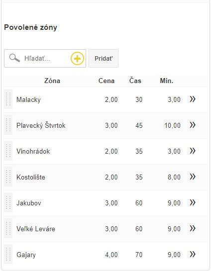 • Zoznam zón / miest, v ktorých sa zabezpečuje rozvoz. Pomocou poľa Hľadať je možné nájsť mesto / obec ktoré chcete do zoznamu pridať. Po zadaní názvu a kliknutí na tlačidlo Pridať sa zobrazia podmienky dopravy v danej zóne / meste.