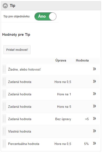 V rámci tipu je možné nadefinovať aj kombináciu, resp. viacero možností pre jeho zadávanie, čím zákazník získa viac možností sa rozhodnúť. Okrem toho, je možné v jednotlivých možnostiach nastaviť aj to, či sa použije pevná suma, napr. pri percentuálnom tipe, alebo sa hodnota zaokrúhli. Ďalšie informácie o sprepitnom sa dozviete v článku Sprepitné pre kuriéra v online objednávke donášky.