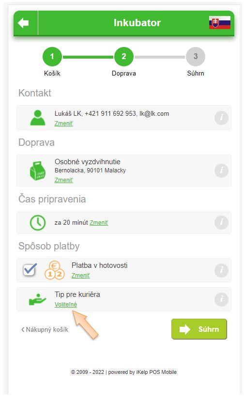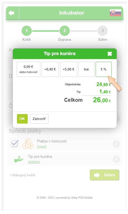 • Tip pre objednávku - v aplikácii je možné preddefinovať aj tip pre kuriéra pri objednávaní. Zadanie tipu je voliteľné a nijakým spôsobom nie je zákazník pri objednávaní nútený ho zadať. Je na ňom, či pri objednávke tip dá, alebo nie. Ak zákazník chce dať tip, vie tak spraviť aj pri online platbe, kedy je platba zrealizovaná rovno s touto hodnotou.