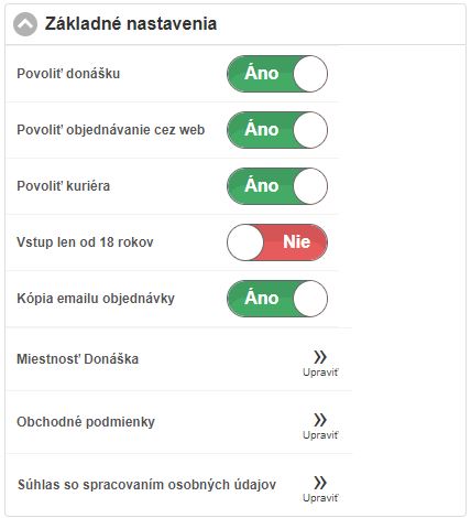 • Povoliť donášku - ak je donáška v nastaveniach aplikácie vypnutá, nie je možné aktivovať online objednávanie cez web, nie je možné zadať čas vybavenia objednávky a nie je ani možné do objednávky doplniť informáciu o výške dopravy.