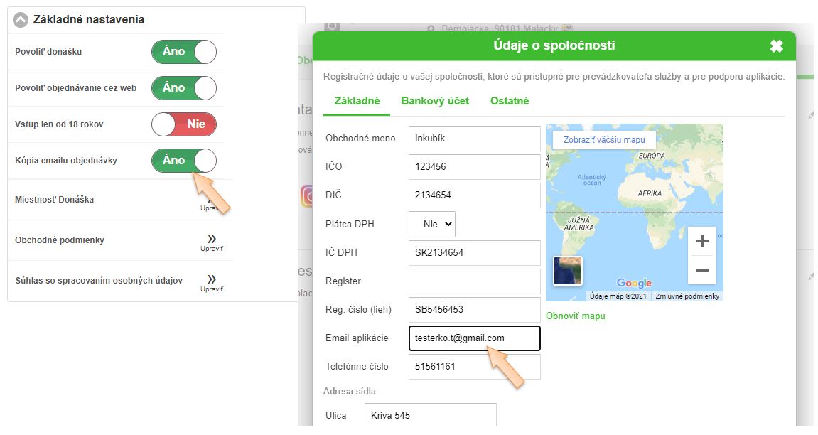 • Kópia emailu objednávky - posielať na zadaný email prevádzkovateľa kópiu emailu objednávky. (Kópia sa posiela na email zadaný v časti O prevádzke - Registrané údaje o spoločnosti - neverejné.)
