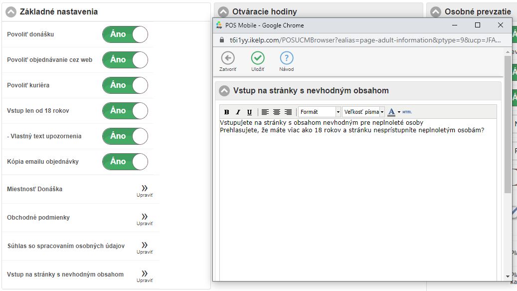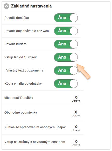 • Povoliť objednávanie cez web - ak je daná možnosť aktívna, zákazník vie vytvoriť online objednávku. V prípade, že sa možnosť online objednávania vypne, zákazníci nebudú mať možnosť si u vás vytvoriť online objednávku.