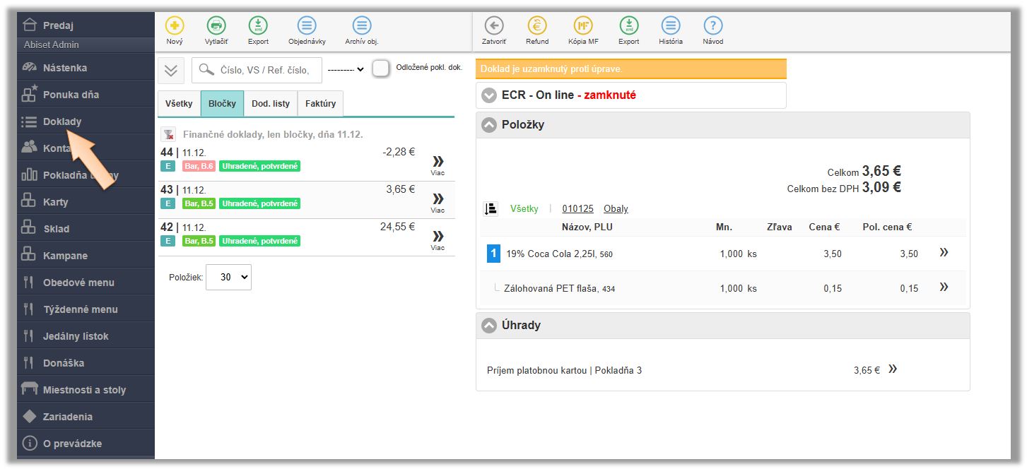 - Kliknite v menu aplikácie na Doklady.