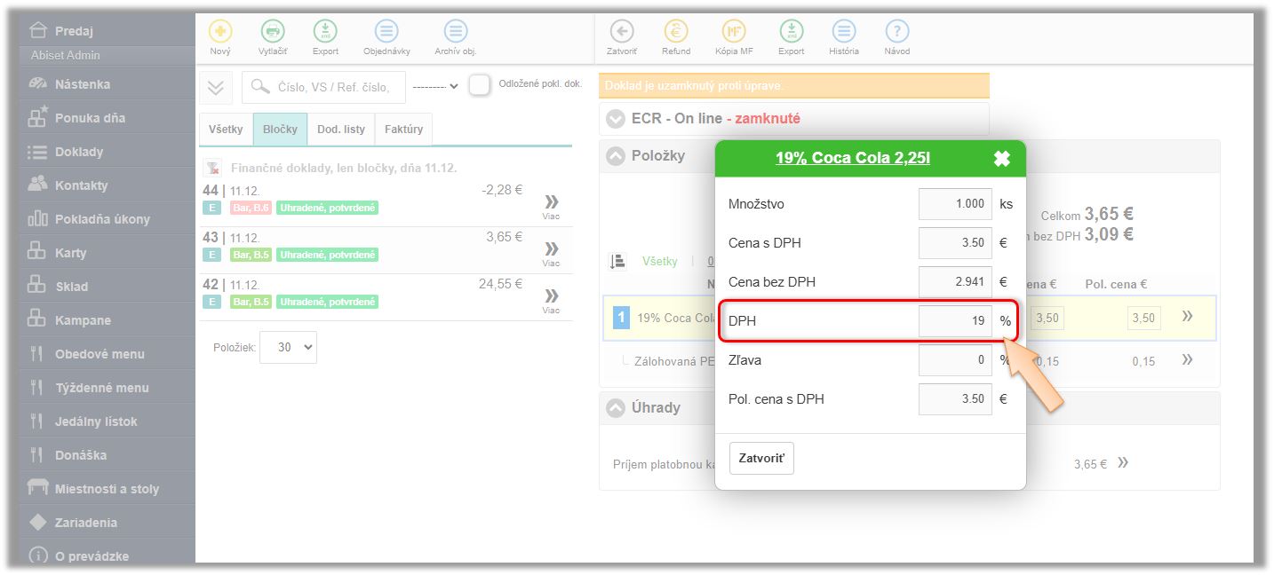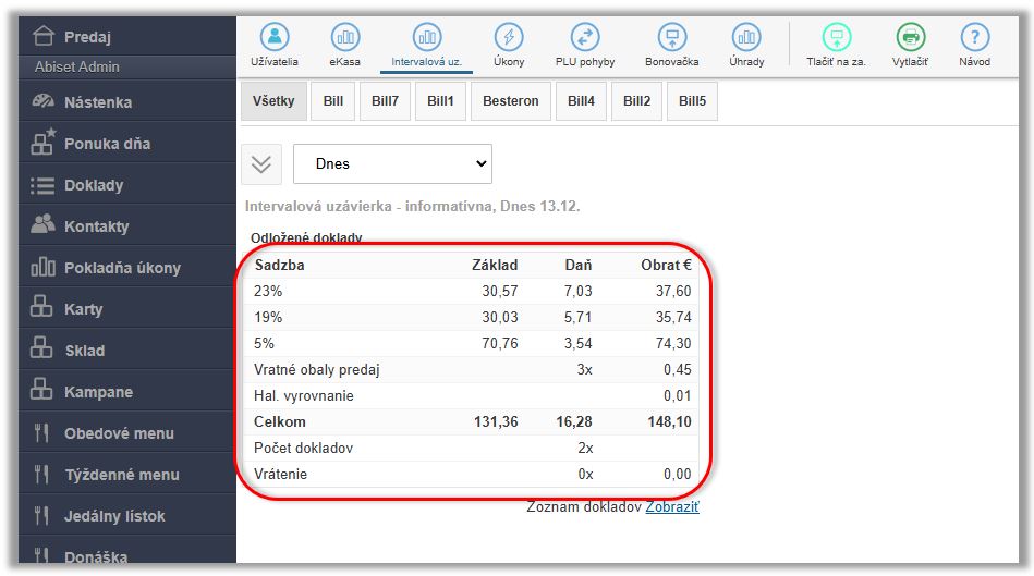 To, s akou výškou DPH boli jednotlivé doklady naúčtované, je možné zobraziť v detaile daného doklad. Ak chcete mať prehľad o správnosti účtovania dokladov, je možné si zobraziť prehľad predajov aj s rozpisom DPH v časti Pokladňa úkony.
