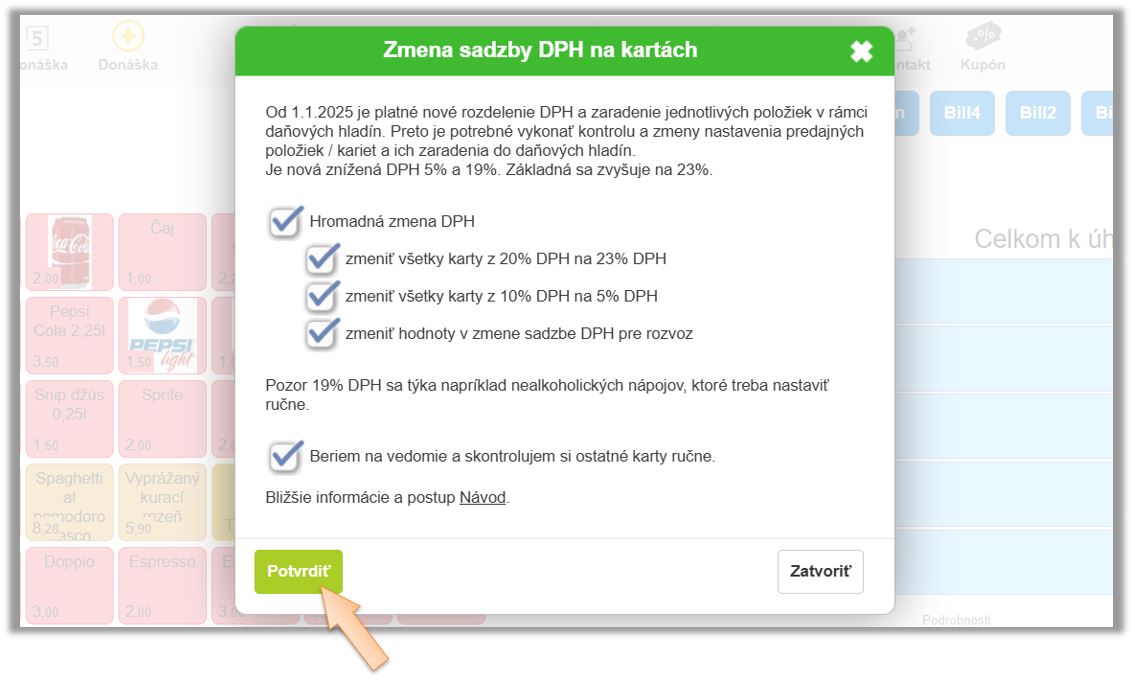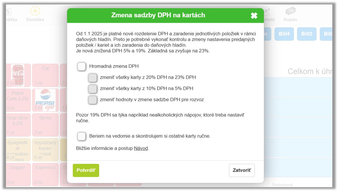 Následnú zmenu je potrebné aplikovať kliknutím na Potvrdiť. Ako už bolo spomenuté, v prípade niektorých tovarov a služieb nie je možné zabezpečiť automatickú zmenu, je potrebné si DPH vo vybraných prípadoch nadefinovať manuálne. Sadzby DPH je možné meniť jednotlivo na kartách alebo hromadne na úrovni kategórie, až od 1.1.2025 od 00:01. Tieto zmeny je možné vykonať aj v prípade otvorených (rozpracovaných) objednávok. Po následnom otvorení rozpracovanej objednávky alebo po kliknutí na Medzisúčet pred vyúčtovaním sa aplikácia spýta na prepočet cien.