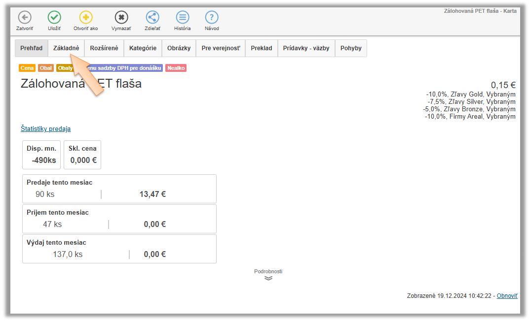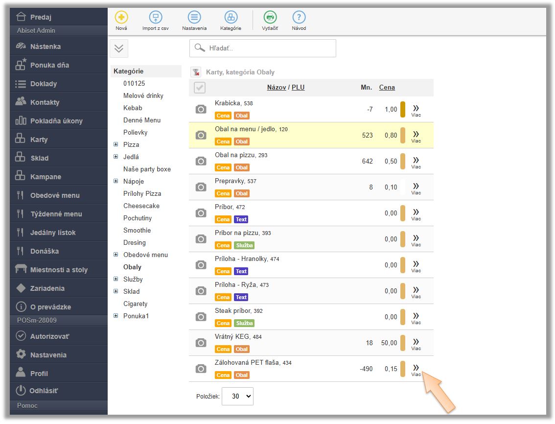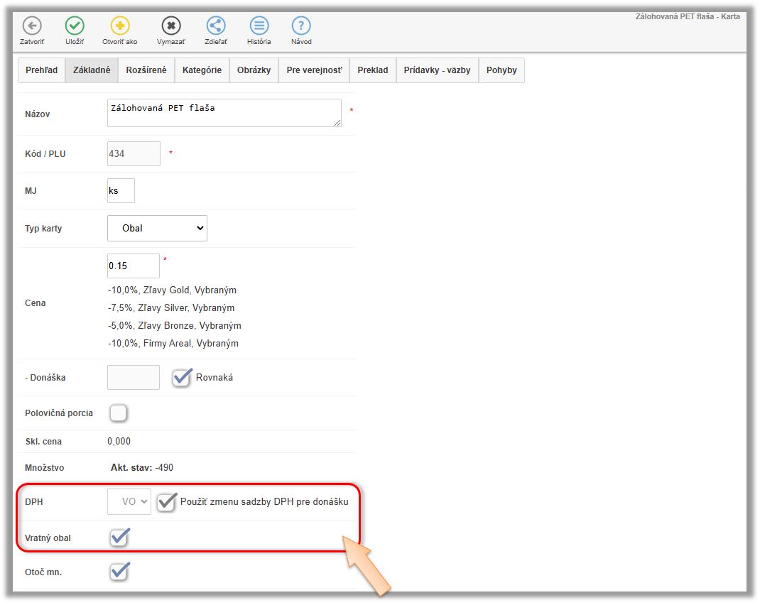 - S uvedeným nastavením súvisí aj príznak Otoč mn. - ak je nastavený, po naúčtovaní danej položky do predaja aplikácia automaticky otočí znamienko množstva na záporné, nakoľko sa predpokladá, že sa obal vykupuje. V tomto prípade by daná položka mala byť naviazaná na tovar, ktorým sa predáva. Ak sa obal nepredáva cez väzbu na inú kartu, príznak nenastavujte. Následne je na obsluhe aby naúčtovala položku so správnym množstvom či už záporným, alebo kladným. (Ak je položka naviazaná napr. na kartu "CocaCola 0,33l fľaša", automaticky s jej naúčtovaním sa do predaja pridá aj fľaša s kladným množstvom. Akonáhle sa obal naúčtuje samostatne, znamienko sa otočí.)