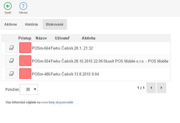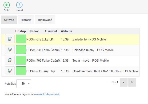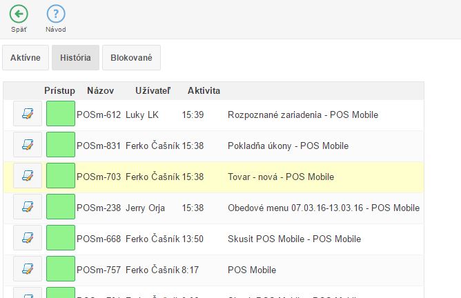 V tomto zozname je možné si zobraziť práve aktívne zariadenia, ktoré pristupujú k aplikácií, alebo zoznam zariadení, ktoré boli zablokované. V zozname je aj zobrazený dátum a čas poslednej aktivyty zariadenia.