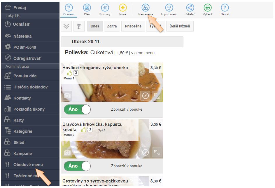 Ak potrebujete rozšíriť počet ponúkaných obedových menu napr. zo štyroch na päť, alebo potrebujete do ponuky zaradiť ďalšiu polievku, je potrebné vytvoriť ďalšiu kartu pre predaj obedové menu. Túto kartu vytvoríte po kliknutí v menu aplikácie na možnosť Obedové menu, následne vyberte z ponuky možnosť Nastavenia.