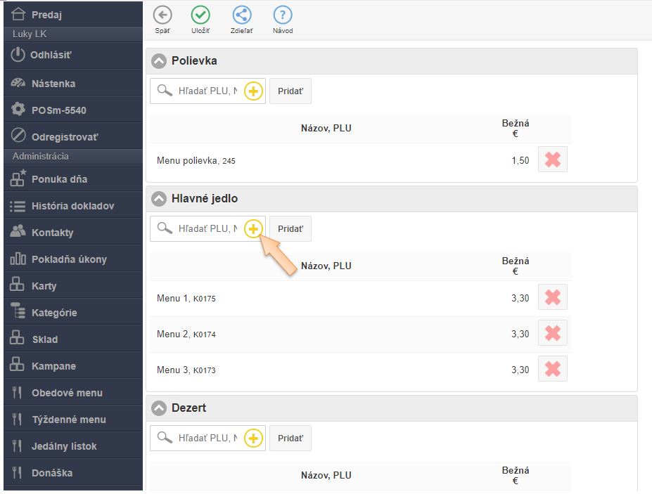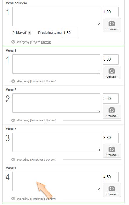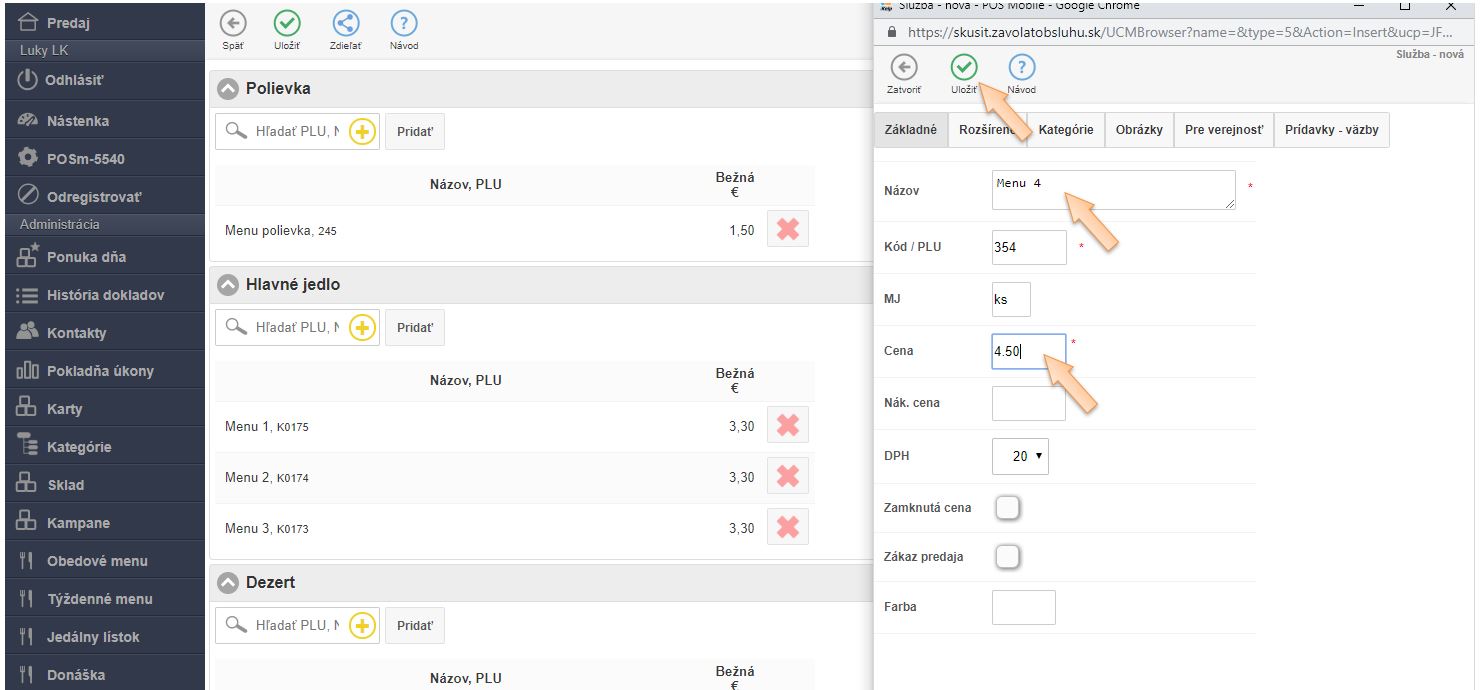 Vytvorenie novej karty pre Obedové menu