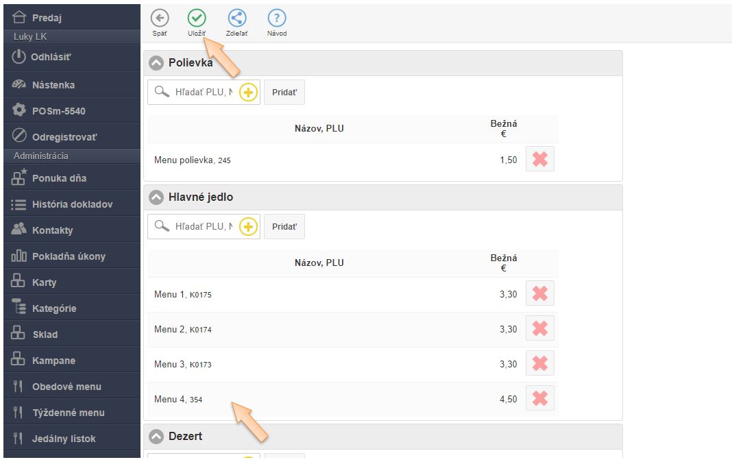 - Ak už máte vytvorený dostatočný počet kariet pre vaše menu a jednotlivé karty sú priradené k príslušnému druhu (polievka, hlavné jedlo alebo dezert) je potrebné kliknutím na tlačidlo Uložiť potvrdiť vykonané zmeny v nastaveniach obedového menu.