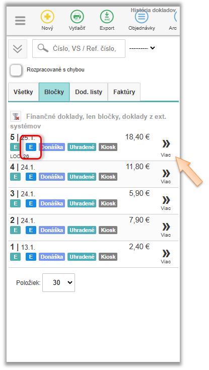 - Doklady z externých systémov - doklady, ktoré sa do aplikácie dostali z externých systémov, alebo kiosku. (Doklady, ktoré boli vyúčtované a poslané na eKasa zariadenie v externom systéme, ale kvôli odpisom zo skladu a štatistikám predaja je potrebné ich evidovať aj v rámci aplikácie.)