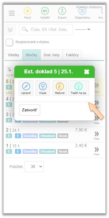 Typ dokladov, ktoré boli riadne vyúčtované a odoslané na eKasa tlačiareň, ale nevytlačili sa, a je potrebné ich dodatočné odoslanie na zariadenie.