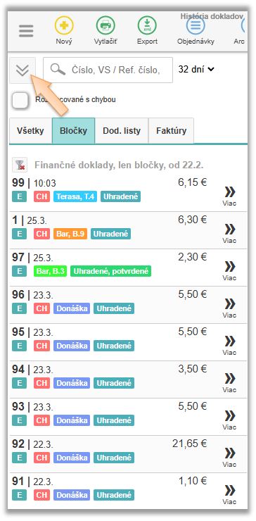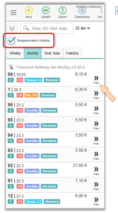 Filtrovanie Rozpracovaných dokladov (pre možnosť ich dodatočného odoslanie na eKasa portál) a Externých dokladov