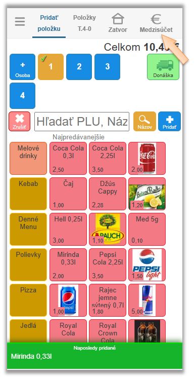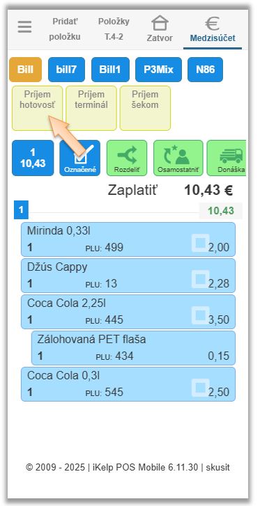 - Kliknite na tlačidlo Medzisúčet pre vyúčtovanie dokladu a vyberte požadovaný typ platidla. (Hotovosť / Šek / Príjem terminálom ...)