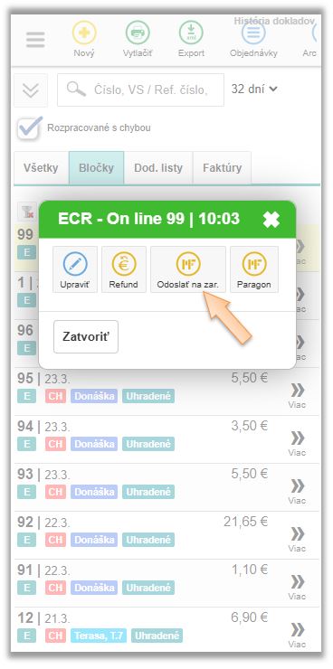 - Kliknite pri doklade na ikonu Viac a vyberte možnosť Odoslať na zar. (pre odoslanie dokladu na zariadenie).