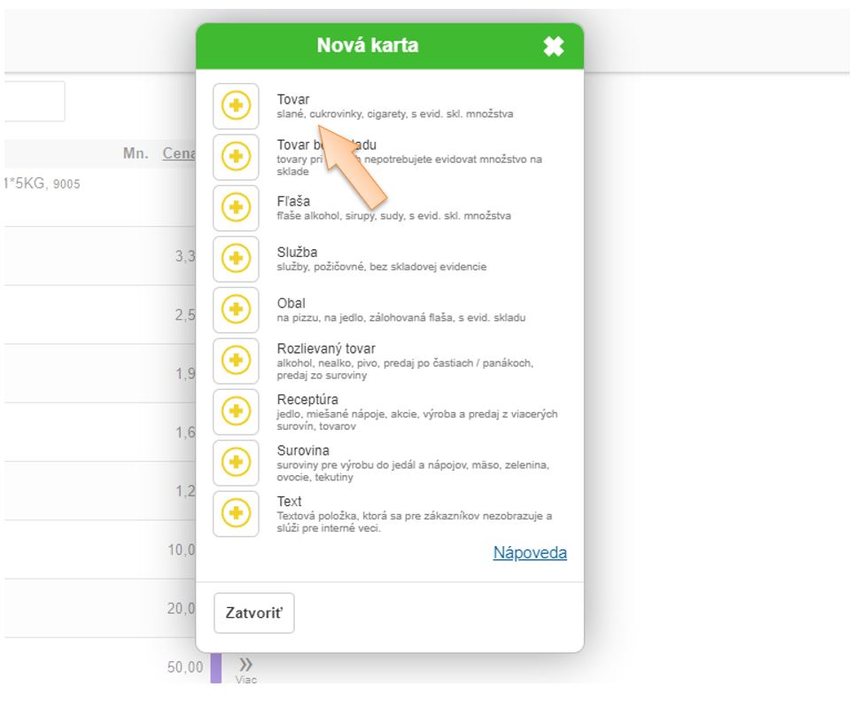 2. Vyberte príslušný typ karty Tovar alebo Fľasa.