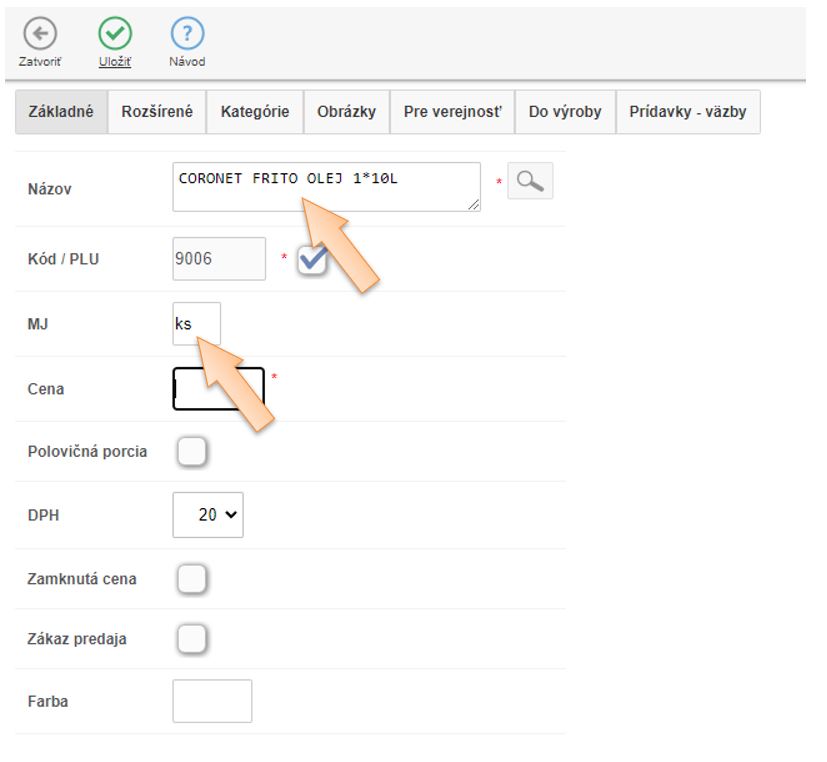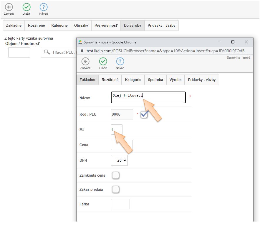 4. V záložke Do výroby kliknutím na ikonu + vytvorte kartu suroviny používanej na výrobu receptúr.