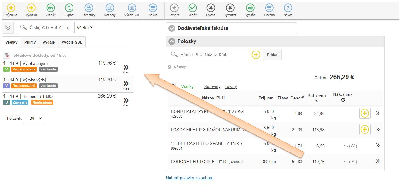 Po uložení skladového dokladu aplikácia automaticky vytvorí skladový výdaj s názvom Výroba výdaj, ktorou sa vydá prijatý tovar zo skladu a spraví sa automatický príjem na nadefinovanú surovinu v danom objeme pod druhom Výroba príjem. Tieto doklady sú vidieť aj v zozname skladových dokladov, a po rozkliknutí je možné si pozrieť väzbu medzi týmito dokladmi.