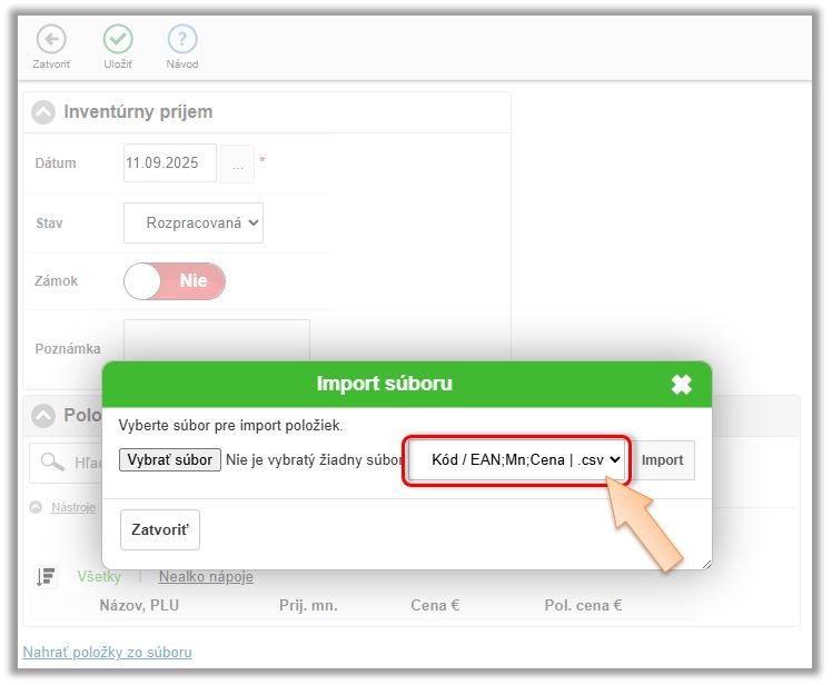 - Kód / EAN - identifikátor tovaru. Pri príjme pomocou CSV sa predpokladá, že skladové karty už v sú v aplikácii vytvorené. Aby systém vedel položky správne spárovať, je možné použiť tieto hodnoty.