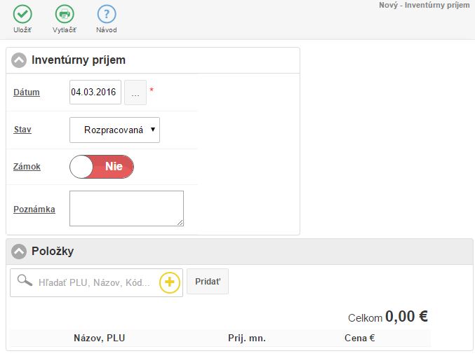 - Celkom - výsledná celková cena položiek v inventúre. (Prijímané množstvo na položke krát jednotková cena.)