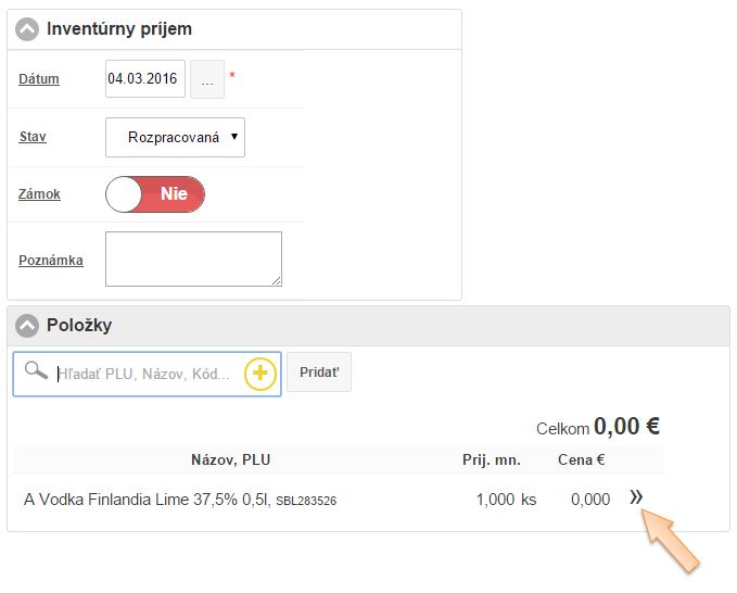 - Upraviť položku - zobrazí sa detail položky kde je možné zmeniť počet kusov alebo cenu, prípadne položku z príjemky odobrať.